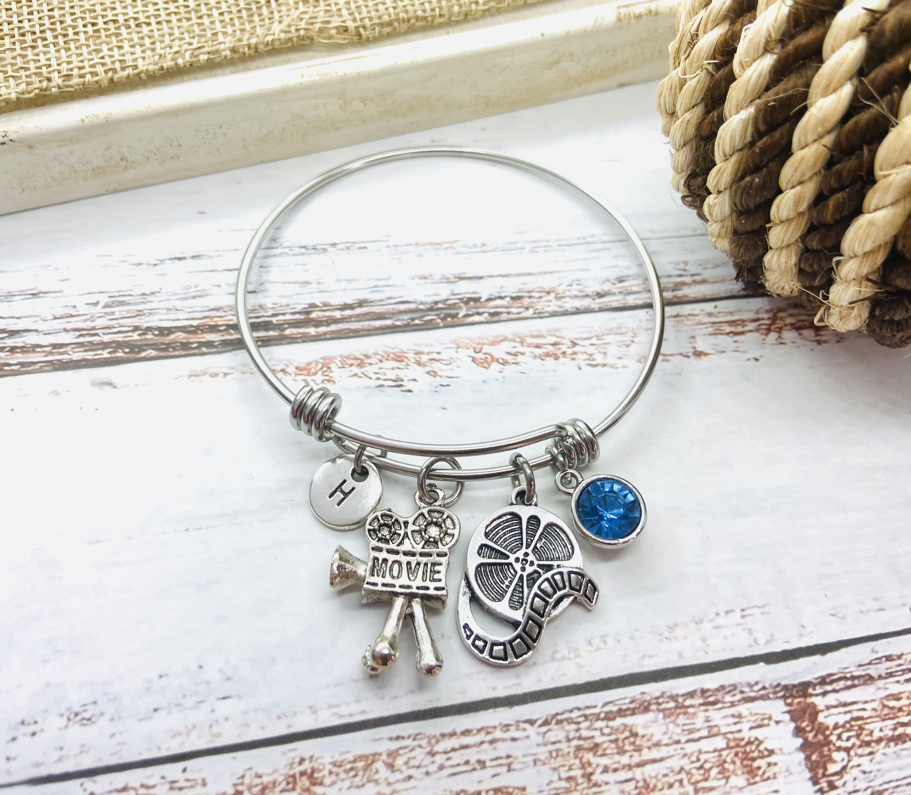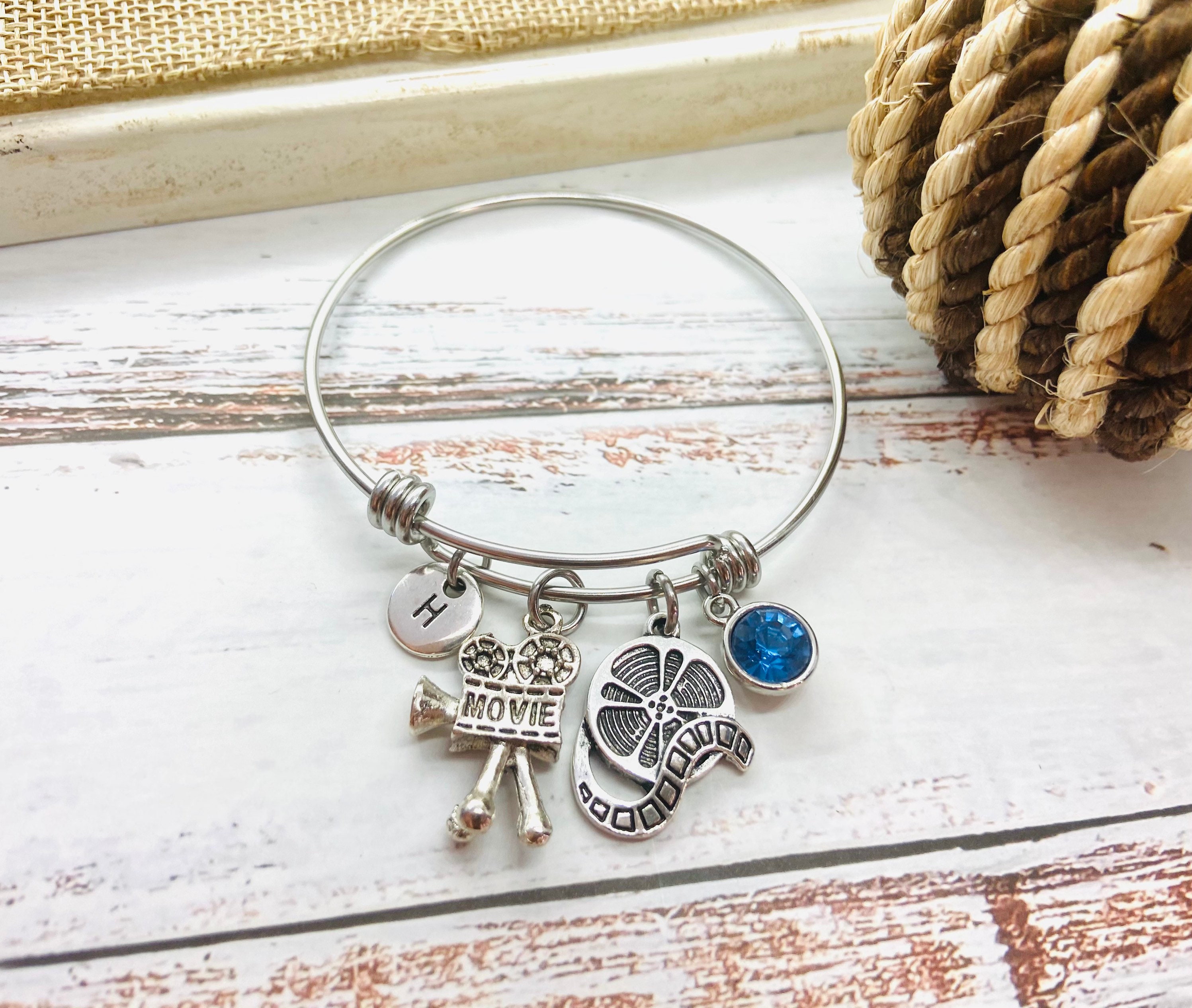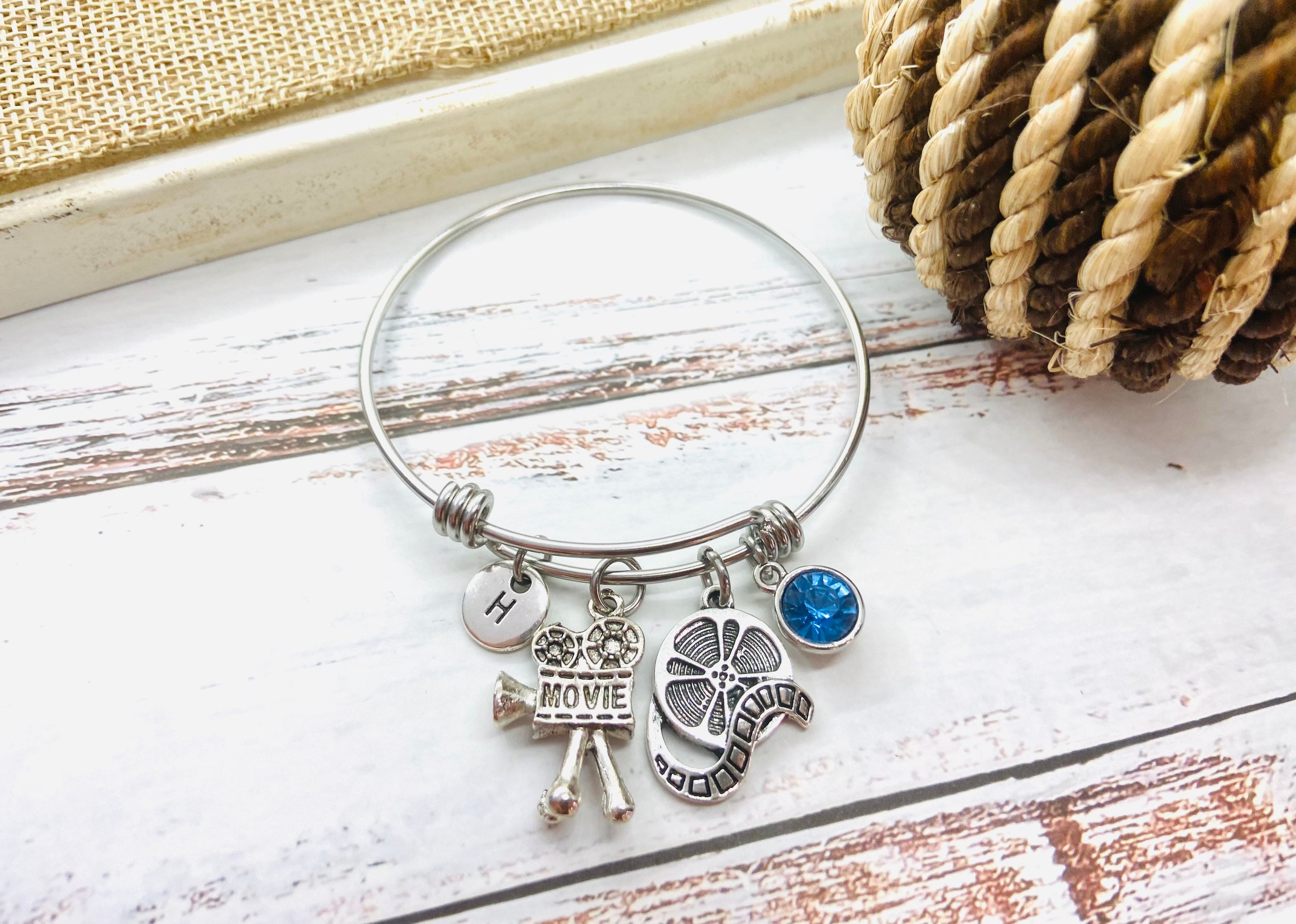 Movie camera bangle, movie camera bracelet, film, expandable bracelet, charm bangle, monogram, initial bracelet